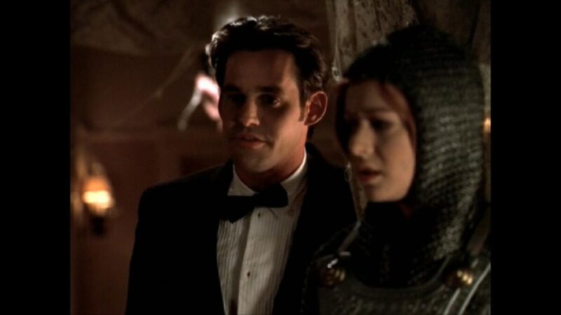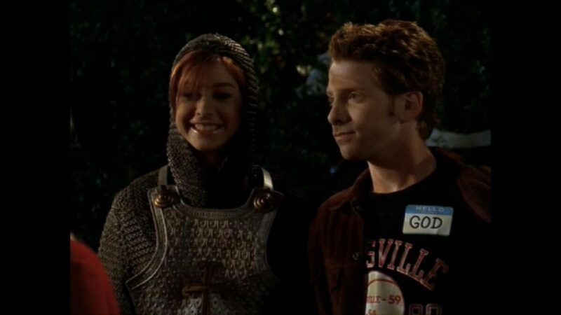 Showing up at the party, Willow (Alyson Hannigan) is Joan of Arc, and Oz is dressed as he usually is with a name tag that says “God.” Unbeknownst to them, all hell is breaking loose. Willow goes through a very real cobweb in the house that Oz shrugs off to frat boys not being up to date on house cleaning, then notices an alive tarantula on Willow’s shoulder and quickly gets it off. See, right there after that, I would be leaving. Buffy sees something on the carpet and checks it out. It is real blood. Then they are swarmed by bats! What is going on? All of a sudden, they hear a voice say, “Release me.”