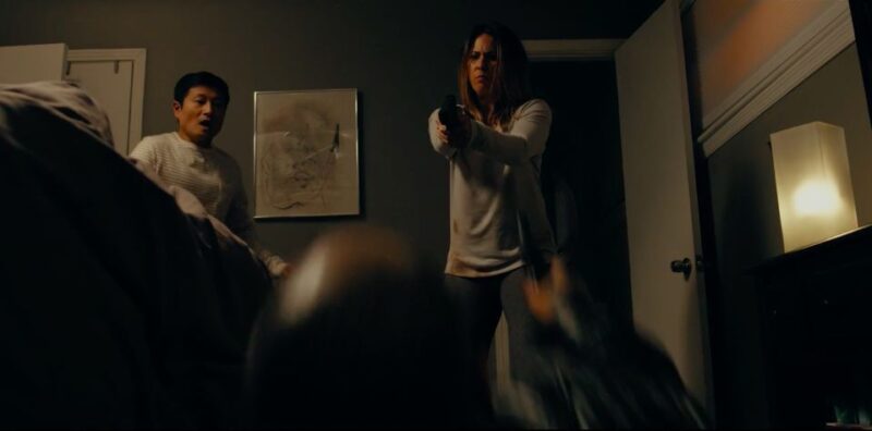 Heather wakes up after hearing a noise. Armed with a flashlight and her gun, she searches the perimeter. Something to know about Heather is that she is an ex-Sergeant who suffers from PTSD. But let’s get to the surprising part. She comes back to her bedroom where Mark and robber Parker are and ends up killing Parker. Heather wants her husband to call the police, considering there is a dead body. But Mark takes a shocking route. He wants to wait an hour before calling them to search the house for what Parker was there for since it is worth a lot of money. After a short argument, she agrees. This scene shows the almost desperation Mark has to fix things and make things right.