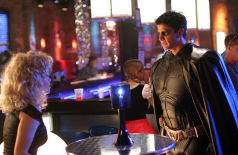 People start to arrive at Tric in all sorts of costumes, as we see Brooke and Haley arrive (Haley as Sandy from Grease) as Mouth appears, saying hi to them. Next, Batman enters and heads over to Peyton, where we hear Nathan’s voice underneath the masked costume, so he can “see everything and pretend like he was never here.” Peyton points out that Haley looks hot, to which Nathan replies, “Haley always looks hot.”