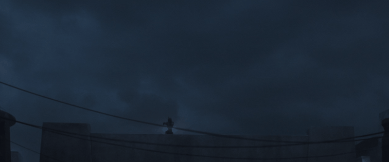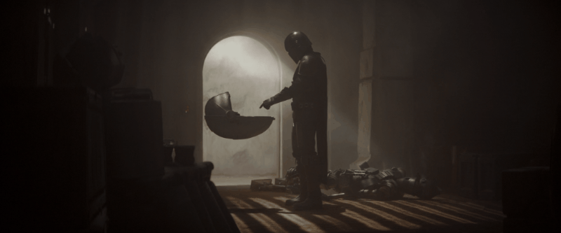After the audience collectively gasped as we all laid eyes upon the unthinkably adorable Child for the very first time, and once Din neutralized IG-11, the camera panned out to show this simple yet beautiful shot of the bounty hunter and his bounty reaching out toward one another. The dim lighting and dust floating in the doorway, along with the framing of Din and the Child’s pram, create a truly memorable image.
