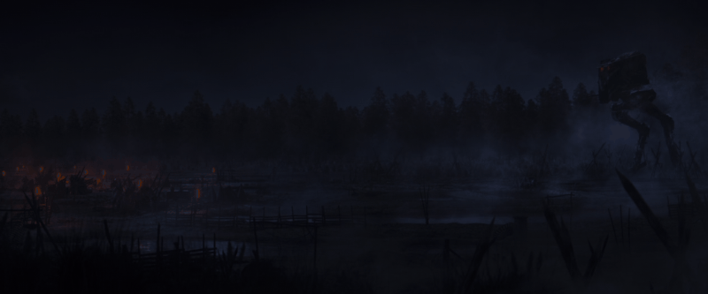 The village that Din took temporary refuge in was set in the middle of a clearing, which the film crew took full advantage of when shooting and framing the battle. The AT-ST’s nighttime approach on the village was ominous, as the front hatches glowed like threatening red eyes in the darkness. As it stood at the threshold, waiting to attack, fog seeped out from the trees as the village’s torches burned on.