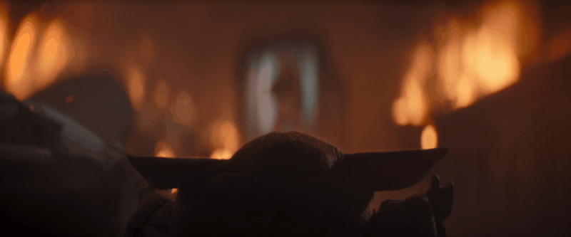 In the final episode of the season, the Child taps into its powers once more to help protect Din, Cara Dune, and Greef Karga from the explosion of flames threatening to engulf them all. Tiny hands raised in the air and a face deep in thought, it sends the barrage of heat flying back out the doorway. The reflection of the fire in Din’s helmet was also an excellent touch.
