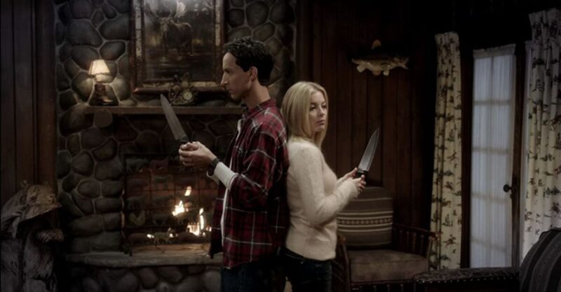 They each begin to tell a scary story that takes place at a cabin in the woods. First up is Abed (Danny Pudi). In the isolated cabin in the woods, he and Britta are there to get away. Abed is prepared with a radio. On the radio, there is an announcement that an escaped psychopath is on the loose. So Abed and Britta stand back to back, holding knives and waiting. Sounds safe and logical to me.