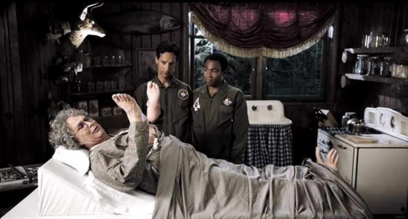 That brings us to Troy (Donald Glover). He and Abed are Top Gun pilots and find themselves at a cabin after crashing and encounter a mad doctor Pierce (Chevy Chase). Pierce sews them together, but that has a side effect of giving Troy and Abed psychokinetic powers. They knock out Pierce and put his feet on his hands and hands on his feet, and his butt on his chest.