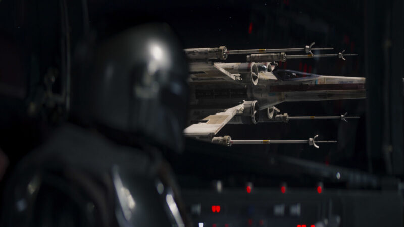 Din wakes back up sometime later to an alert beeping from the cockpit. Their travels have been interrupted by two X-wing pilots, who slowed down because the Razor Crest’s transponder isn’t emitting. Din tells them that, because he’s pre-Empire surplus, he isn’t required to run a beacon. They inform him that the sector he’s traveling through is under New Republic jurisdiction, and all craft are required to run a beacon. Thinking he’s off the hook, Din bids them farewell with an awkward, “May the force be with you.” However, they ask for him to send them a ping, because they’re out sweeping for Imperial holdouts. Din fumbles around, making up an excuse, though he eventually gives in. Unfortunately, the pilots then inquire if the Razor Crest was in the proximity of New Republic Correctional Transport Bothan-Five, and Din quickly nopes himself out of that situation.