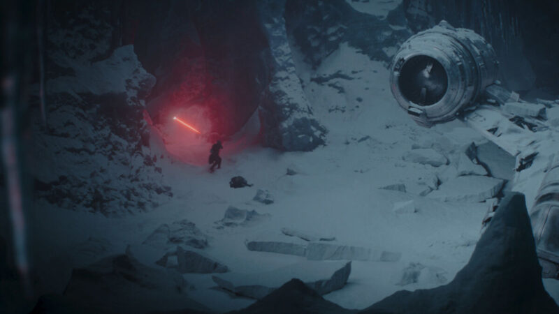As Din works on the Razor Crest, the Child attempts to get his attention and he realizes that Frog Lady has left the ship. They track her footsteps into a cave and find her lounging in a hot spring with her eggs. Din urges her to get back to the ship, scooping the eggs back into the container as the Child eyes them hungrily. Din scolds him before he can grab another quick snack, and the naughty toddler turns around and eyes a much more appealing meal — the large assortment of eggs that happen to be littering the cave’s floor. Sniffing the air, the Child takes off through the snow and cracks one of the eggs open to eat what appears to be a small spider. The other eggs start to rumble ominously, and even larger white spiders begin t0 hatch out of them. The Child comes running back to Din as the spiders scuttle about in the cave. And, as if the legion of newborn arachnids wasn’t nightmare-inducing enough, a gigantic one comes trashing out from a deeper part of the cavern. Whereas the first episode heavily leaned on the show’s western vibe, this slight horror angle is a fun and welcome addition to the series.