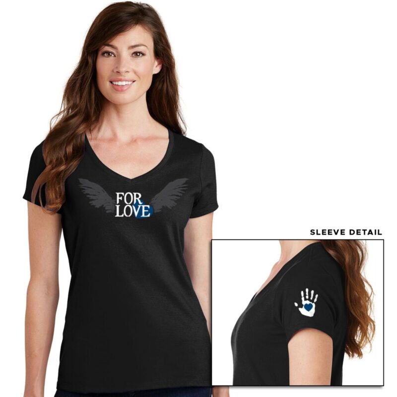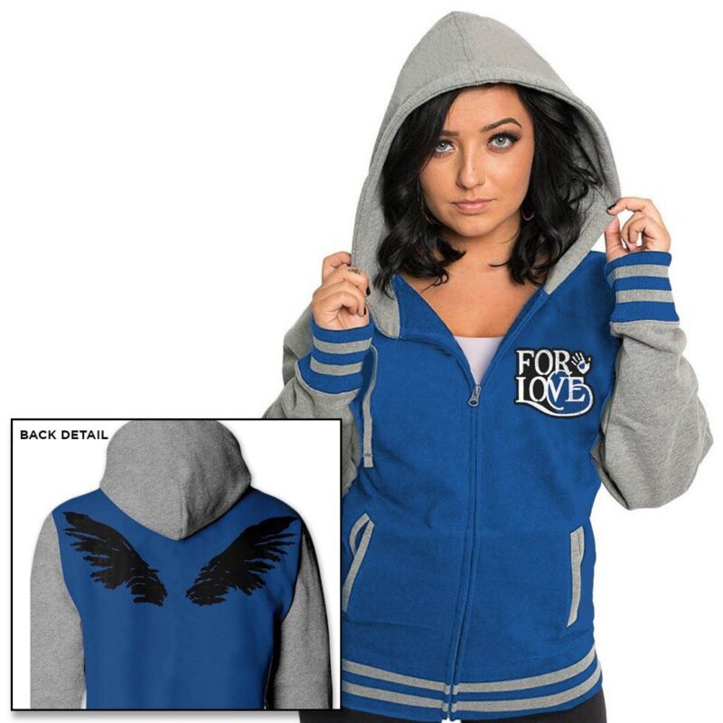 First up, we have the new Misha Collins “For Love” Collection that celebrates the unforgettably heartbreaking moment when Destiel became canon (“Despair” is going to haunt us forever… but in the absolute best way). The collection includes a heart necklace bordered by angel wings, a patch that says “For Love” with the infamous handprint next to it, a blue varsity jacket with black wings etched onto the shoulder blades, and a short sleeve tee that says sports the “For Love” design with a handprint on the shoulder. Stands, you just couldn’t help yourself, huh? 100% of the proceeds from this item will benefit LGBTQIA+ and homelessness organizations.