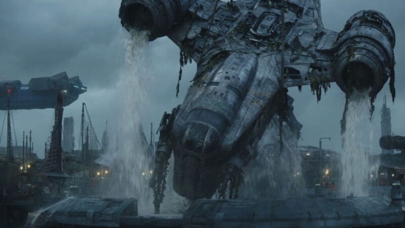 The episode opens not too far from where the previous one left off — Din, the Child, and Frog Lady have almost reached their destination, the estuary moon of Trask is finally within view. The Razor Crest chugs along, and it’s obvious that Din wasn’t lying when he said that the ship would be limping the rest of the way there. It will be a miracle if it survives the rest of the season. Unsurprisingly, the ship’s landing array isn’t responding. They enter the atmosphere at a free fall, and the Razor Crest begins to resemble a giant, metal meteor as flames engulf the ship. A flight control operator continually pages the ship, demanding that the Razor Crest reduce speed for landing at the port, and Din manages to use the last of the fuel to bring it down steadily at the last moment because he’s nothing if not efficient. However, it’s all a wash anyway as an engine explodes and the ship unceremoniously tips off of the dock and into the water. Whoops.