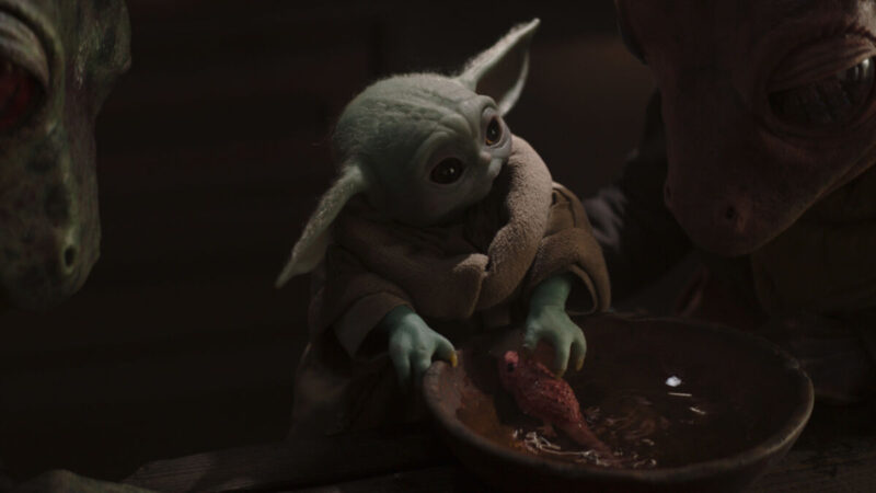 Din inquires with the inn worker about the other Mandalorians while the Child attempts to eat a bowl of chowder, out of which crawls a squid that latches onto his head. Ever the dad, Din scolds him and tells him not to play with his food. A Quarren fisherman approaches the table and tells Din that he can bring him to the other Mandalorians. They set sail on the Quarren’s vessel as Din and the Child begin to channel their inner Pirates of the Caribbean. The Quarrens insist that Din and the Child watch them feed the mamacore that’s held captive on the ship. And … you guessed it …