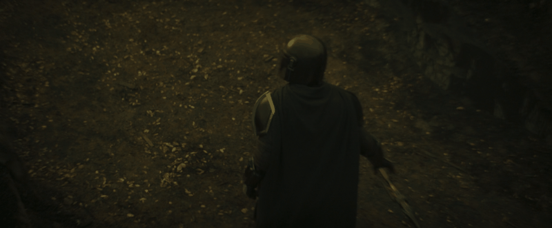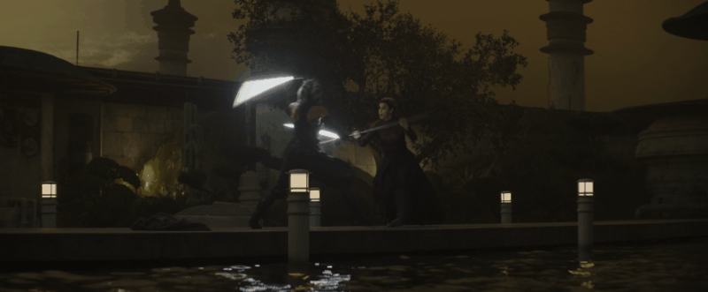 Ahsoka scales the city wall, taking out the guards along the top swiftly, and finds that the Magistrate and her guards are waiting for her. She holds up Din’s pauldron and informs the Magistrate that the bounty hunter failed, demanding once more to learn the information that she seeks — “Where is your master?” Rather than answer, the Magistrate instructs her guards to kill Ahsoka, and so a battle begins. Din arrives shortly after, saving the prisoners from their imminent execution, while Ahsoka stalks the guards through the narrow city streets, picking them off one by one. While Ahsoka hops over the next set of gates behind which the Magistrate is hiding, Din blocks her human guard — Lang — from getting to her.