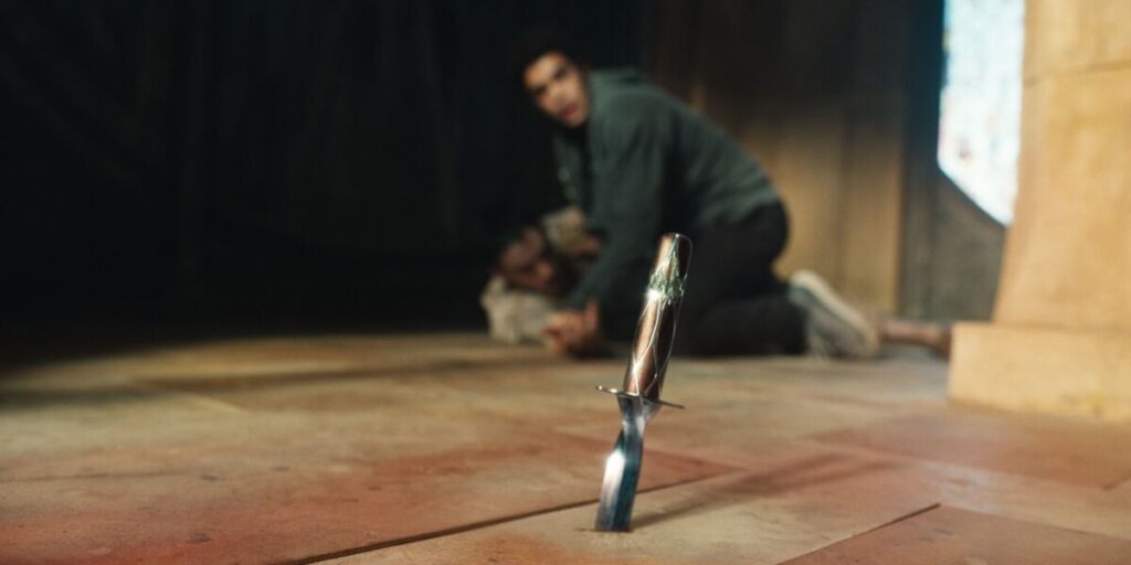 As Will and Lyra emerge at the top of the tower through a trapdoor, they find an older man (Terence Stamp) tied up and hurt. He introduces himself as Giacomo Paradisi, the bearer of the knife, but warns them that there is a boy hiding in the tower who has stolen the knife. They untie him, and as they do, the boy emerges from the trapdoor. He begins yelling at them and threatens them with the knife. Lyra tries to remain calm for once and says that they need the knife. The boy swings the knife at them and cuts clean through a gold statue. The boy attacks Will, and a dramatic fight ensues, including a dangerous moment when they are wrestling on a ledge having broken through a window. The knife is knocked away from the boy, and they both run to reach the knife. The boy gets there first. He swings the knife at Will, cutting off two of his fingers. Giacomo encourages Will to continue fighting, and Will seems to receive a burst of adrenaline. He repeatedly punches the boy and grabs the knife. The knife seems to shine as Will wields it. Giacomo warns the boy to run while he still can. Lyra runs to Will and reveals the two fingers that have been severed, and Will passes out.