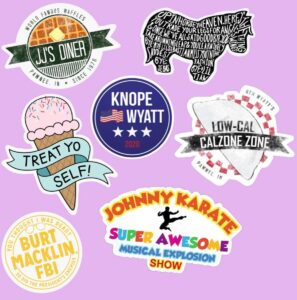 Need to spice up your laptop or add to the collection of stickers you can’t commit to actually sticking anywhere? If you answered yes to one or both of those questions, these Parks and Rec stickers are the #1 choice. Up first from Redbubble artist mkunze is a must-have Burt Macklin (FBI) and Janet Snakehole (a very rich widow with a terrible secret) vinyl sticker. Another Redbubble option comes from J. Elizabeth, who offers a variety pack of vinyl stickers that feature Leslie Knope in various and very relatable moods, which you can find here. On Etsy, Flamboyant Flamingo Co sells a variety of themed stickers from the show. They feature the best non-breakfast food (calzones, duh), Sweetums, Li’l Sebastian, Entertainment 720, and more. Find the one featured in the photo above here, and the second option of stickers here.