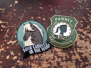 First up are a selection of enamel pins, because who doesn’t love a good pin? From The Colorful Geek on Etsy are pins honoring Li’l Sebastian with “5000 Candles in the Wind” and Leslie Knope’s Pawnee Goddesses. You can purchase “5000 Candles” separately here and “5000 Candles” or Pawnee Goddesses individually (slightly imperfect and still amazing) here. The shop also has a Mouse Rat pin, so you can always represent your favorite band. If jazz is more your style, the Etsy shop Pinnacle Goods created one for Ron Swanson’s smooth alter ego Duke Silver, available to buy here. Last but certainly not least, you can choose from JJ’s Diner and/or Cones of Dunshire pins from Doodle Art on Etsy. These two make a perfect set, as they represent both Ben and Leslie.