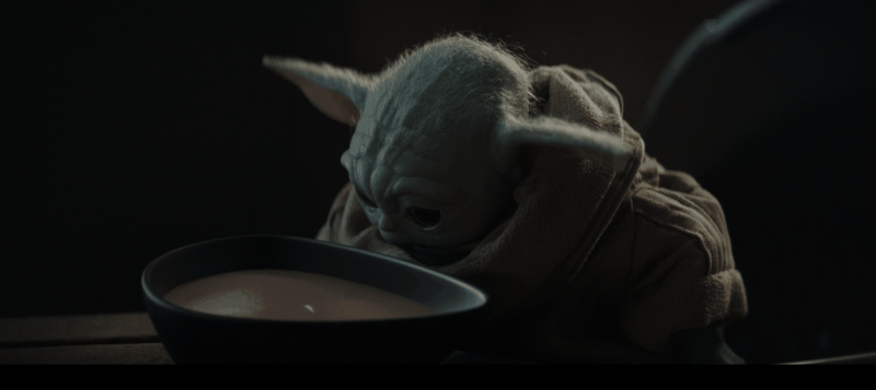 Grogu’s snack rampage continued when he sneakily used the Force to steal his classmate’s macarons, which he brought back to the Razor Crest with him. As Din expertly piloted his ship to take out the TIE fighters on Nevarro, Grogu was having the time of his life in the passenger seat. The excitement was short-lived, however, once Grogu realized that what goes down … must come back up. Liquid macarons, incoming! Din deserves all the credit for taking this accidental dad thing in stride because he leaned back to wipe up the puke from Grogu’s robe without missing a beat. As seen in “Chapter 12: The Siege.”