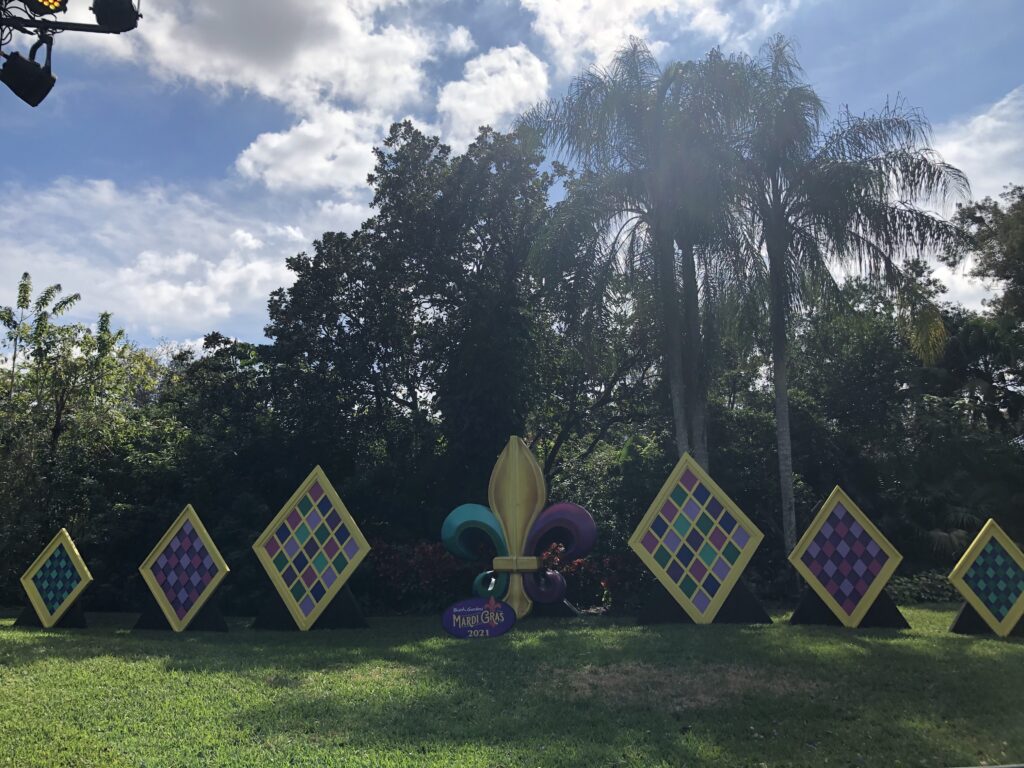 Upon entering the park, there was a photo op for guests who are ready for their close up, with photographers on standby to take your photo. Masks are required to stay on for pictures due to COVID-19 safety regulations, but it’s a great way to began the celebration with a picture to commemorate the event. As you walk through the park to get to the designated Mardi Gras area, you start to hear the sounds of New Orleans, as music is played over the speakers to get you in the Mardi Gras spirit. Purple and green lights compliment the areas surrounding this region of the park as they are wrapped on the trees, as well as purple shades that are hung from the poles to add to the colorful occasion. There are several big signs that say “Busch Gardens Mardi Gras” that are spread across the area, as well as signs on each of the stands, with masks, hats, beads, and more. Vibrant diamonds are placed in the grass areas toward the center of the area, right across from the stage. Next to that is a bead garden, complete with characters who come to revel with guests at certain periods of the day to pass out beads. Not only that, but there are flamingos who are in on the celebration and signs that pull off some great Mardi Gras puns (can’t get enough of the puns). Guests can interact and try their hands at catching the tossed beads, while also completing their bead victory with a photograph. If you thought we were done, you’re sadly mistaken. We can’t forget about the parades! We were lucky enough to catch one while enjoying our stay, and with help from the brass band (who we will mention later), it was an eye-catching display that had us joining in on all the fun! Stilt performers, a belly dancer, what more could you ask for! The decorations and events are full with the spirit of New Orleans and Mardi Gras, so your eyes and ears will not be disappointed.
