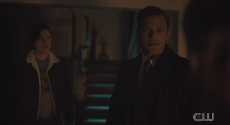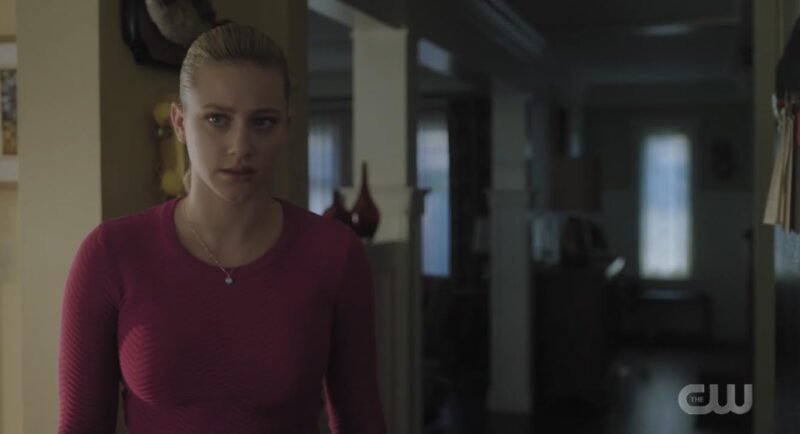 Betty tells Jughead their parents are getting their stuff together and then coming home. Betty’s poor mother. First Chic and now Charles. “Two sons, one real and one fake. Both psychos.” Jughead asks Betty how she’s doing. She doesn’t know. Like, of course her brother is a serial killer. What she can’t stop thinking about are the videotapes. It made perfect sense that Charles was the Auteur. He bugged the house. Jughead points out that Charles would have overheard everything he needed to make those recreations. He doesn’t even know who else could have had access to all that information. He thinks it over and realizes who that one other person is.