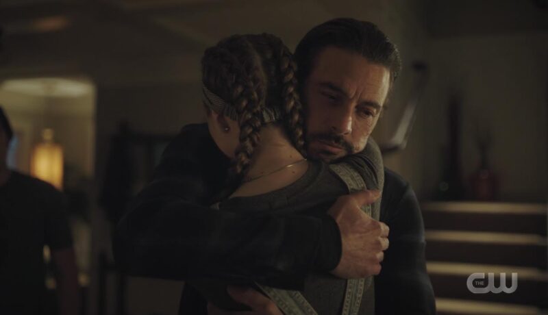 FP asks if they realized what they were doing. Jughead doesn’t think so. He thinks it was a game to them, like make-believe. So much so that they ended up breaking into Riverdale High to recreate that “Killing Mr. Honey” video after she snuck on to his laptop to read the story he was working on. Jughead tells FP their secret hideout was the Lodge’s cabin in the woods, the murder cabin. David, before he was killed by Charles, gave them permission to shoot the prom massacre video inside the Scarlet Suite. The video inside the house was her and Ricky, too. And she did all this to keep Jughead in Riverdale, at least that’s what she told him. Jughead doesn’t think Jellybean understands the enormity and the darkness of what she did. Once home, Jellybean apologizes to FP and he just hugs her, telling her it’s okay.