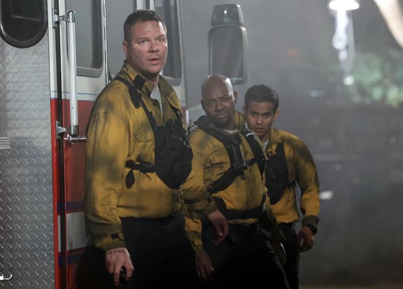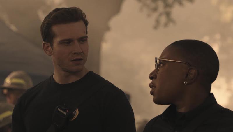 T.K., Mateo and Buck are at the fire line. Mateo tells Buck he’s got a cousin in LA, Marvin. People say they look alike (season 2 earthquake ring a bell?), but he’s in jail. Mateo bets Buck gets some pretty crazy calls out there. “You have no idea.” Buck and T.K. then start comparing some of the calls they’ve had. Soon, though, a car on fire makes its way down the hill and T.K. gets Buck out of the way, saving them both. Buck tells T.K. nice moves, good reflexes. T.K. tells Buck the same thing.