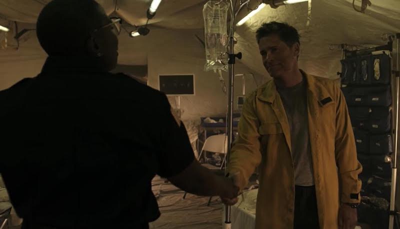 A flashback to the volcanic pool party and what happened to Tim immediately starts off the episode and Owen wakes up at the firehouse, breathing heavily. He splashes water on his face but afterwards, he sees Tim, bloodied and ghost-like behind him. A woman, Savard, wakes up Owen and tells him the wind’s shifted. He and Savard walk out of the tent into daylight, seeing the fire among the mountainside in front of him.