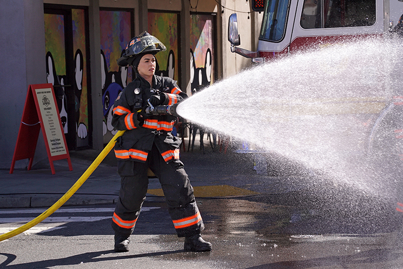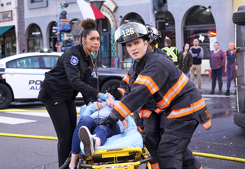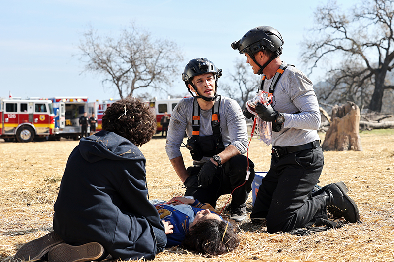 In the new photos below, Owen and T.K. are teaming up while on a call and it seems like the 126 have a new paramedic on their hands. Meanwhile, Paul is visiting someone in the hospital.