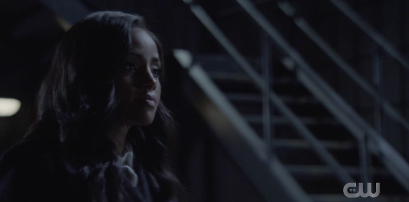 The episode opens with, you guessed it, an alley, where Commander Kane meets with a man who has intel on the whereabouts of the Napier painting. The man tells Kane the painting is in the custody of The Collective, a group of connoisseurs. Kane wants to meet them, but before the man can share much more, he’s stabbed through the back with a spear, one that comes from Coryana. In a matter of moments, Batwoman captures the man with the spear, and then drops in and asks about the man, Kane bringing up the painting. He demands Batwoman release the man, but she refuses to take orders from the Crows. Just before she leaves, she points out “ACAB” graffiti on the wall.
