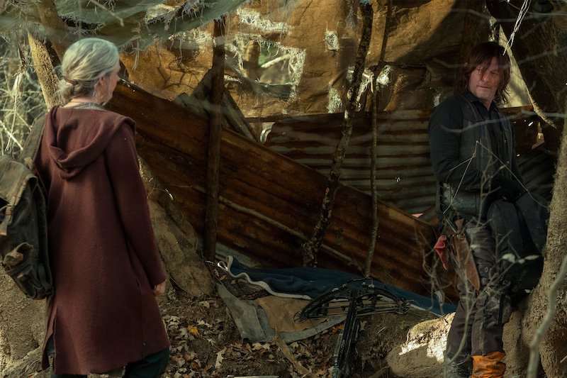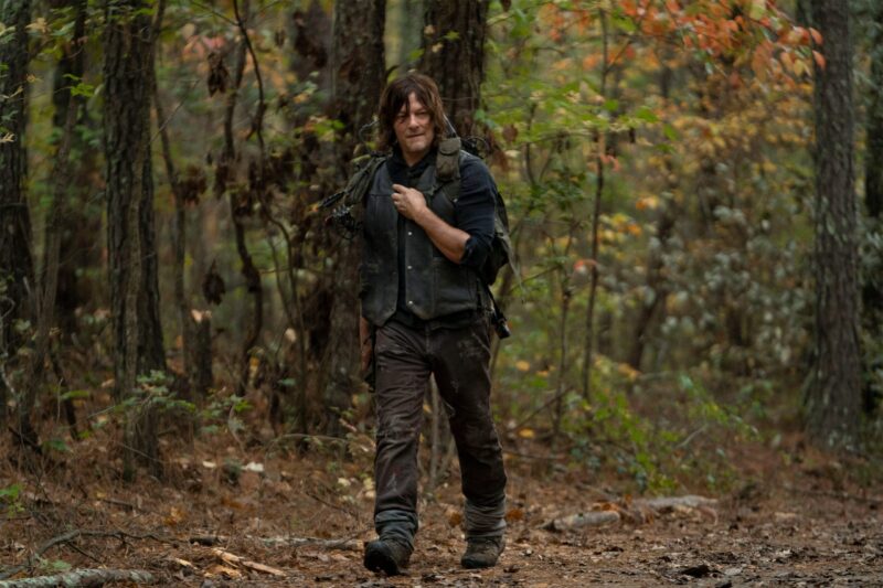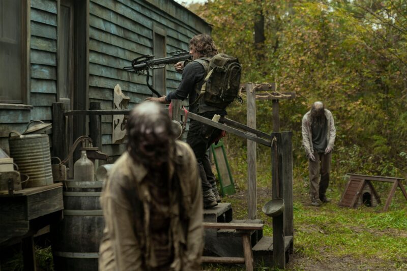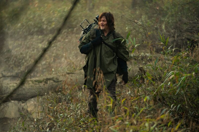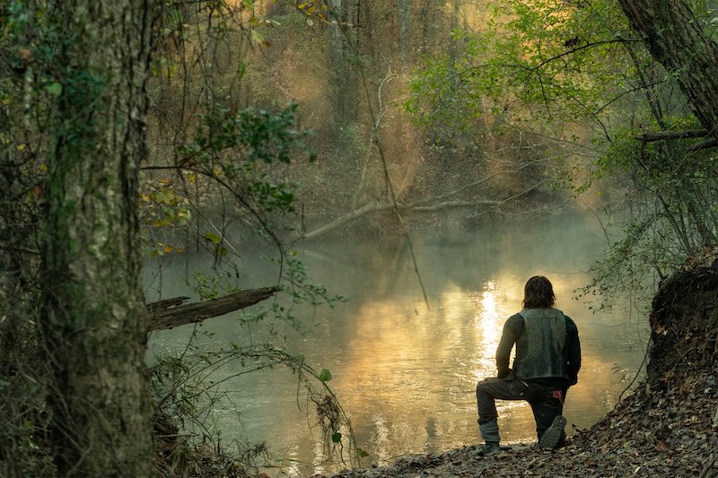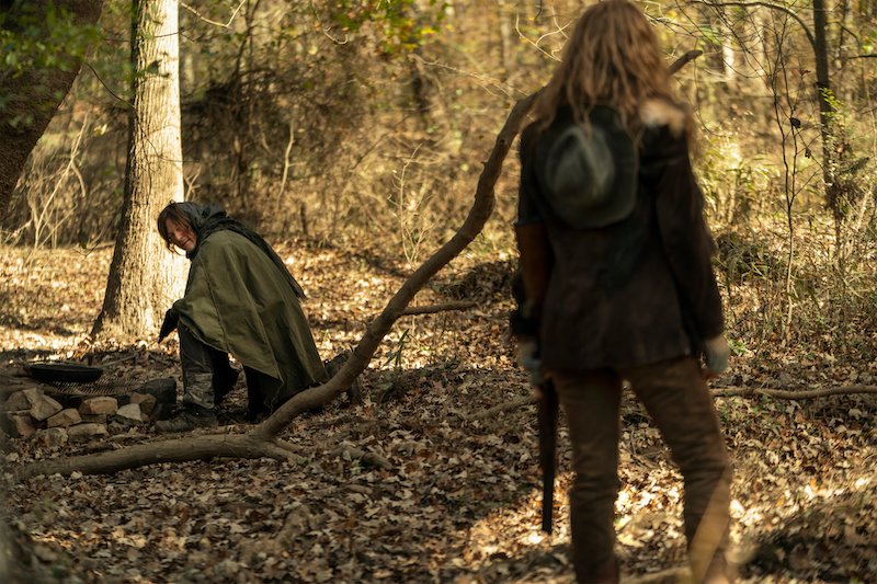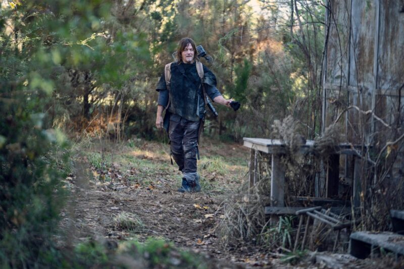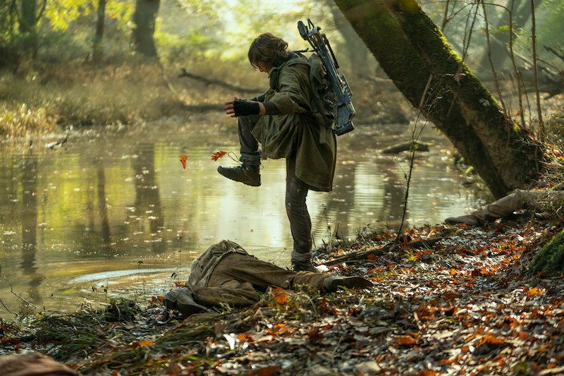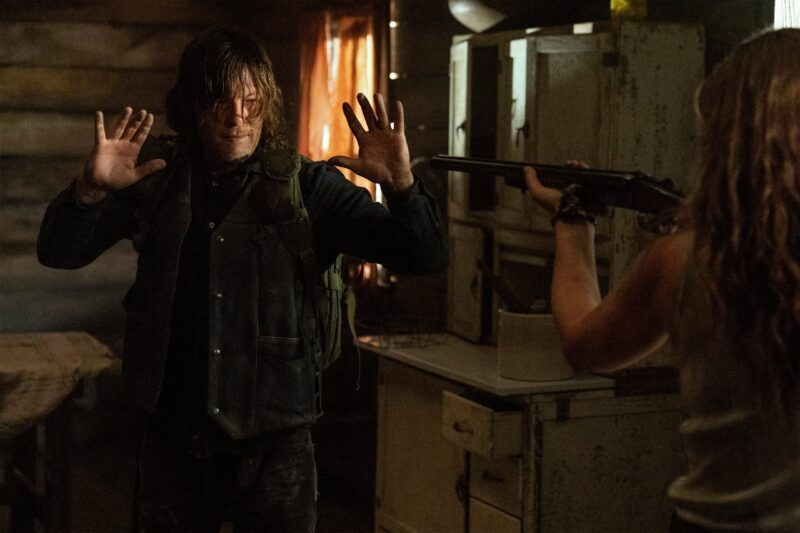 In the photos, we see Daryl and Carol on another adventure, with Daryl still searching for Rick. When the bridge collapsed, it was unclear to them at the time if Rick had survived or perished in the explosion. There’s also a glimpse at Leah (Lynn Collins), the mysterious new character who has a shotgun pointed at Daryl, and, of course, they shared a few photos of Dog because who doesn’t love Dog?