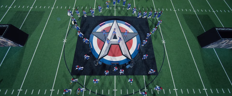 John Walker, the new Captain America, is back at his old stomping grounds — his high school. His partner, Hoskins, gives him a pep talk, it’s time to go to work. The big introduction interview has John taking to the football field, the stands packed, to make his big debut … to a familiar tune.
