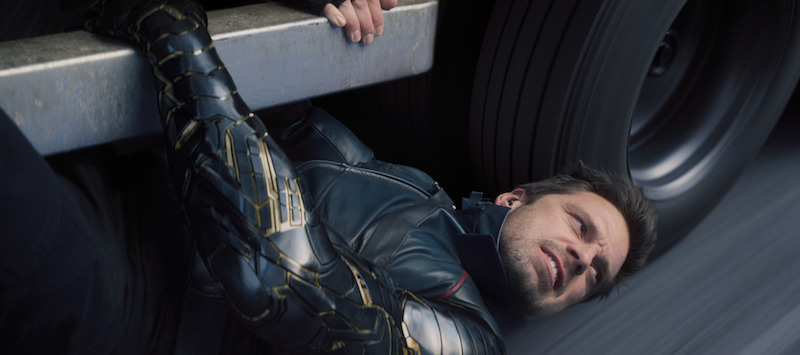 Sam has a plan, a plan that doesn’t account for Bucky being there. And he doesn’t care. He goes through with what he intended to do, leaving Bucky to fend for himself. And he does, hurtling himself 200 feet to the ground below. Sam seemingly appreciates Bucky’s dedication and tells him to head north.