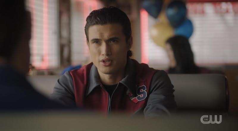 The pancake breakfast at Pop’s is in full swing, Veronica and Archie are talking to the players and their parents. However, the mood changes when Reggie walks in, waving and smiling at Veronica and Archie like nothing’s changed. The two of them sit down with their former classmate. Reggie tells them he’s there on behalf of the Greater Rockland County High School Football League. Everyone is in agreement that the Bulldogs should withdraw from the team. Archie tells Reggie that Riverdale has a right to play but Reggie says the Bulldogs stink and they’re tainting the league’s prestige. Veronica wants the names of every member of this so-called “league.” “Doesn’t it kill you, Coach? To watch the Bulldogs lose week after week?” Archie says it’s not all about winning, but Reggie says to keep telling himself that. He leaves after calling ever Bulldog he passes “loser.”