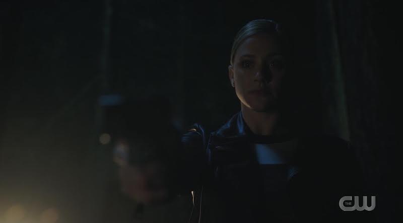 Betty takes Truckerboy69 to the woods and ties him to a tree, repeatedly hitting him. She takes a gun out and tells him he is still preying on those girls exactly the same way he preyed on Polly. Truckerboy69 says he has a family. “I had a sister.” No one looked out for those girls, no one protected them. Betty couldn’t even protect Polly, but she can deliver justice. She cocks the gun and aims it at him. But before she has a chance to pull the trigger, Betty’s phone rings. Jughead, panicked, tells Betty it’s an emergency and that one of his students is missing. He thinks he’s on the Lonely Highway. Betty tells him she’s on the highway, 10 miles north of town. Jughead tells her she’ll meet her halfway and that his name is Lerman Logan, he’s 14. Betty’s on his way. She hangs up and puts her arm down and tells Truckerboy69 she’ll have someone untie him tomorrow, if she remembers.
