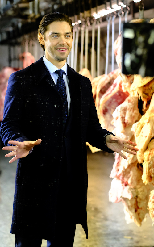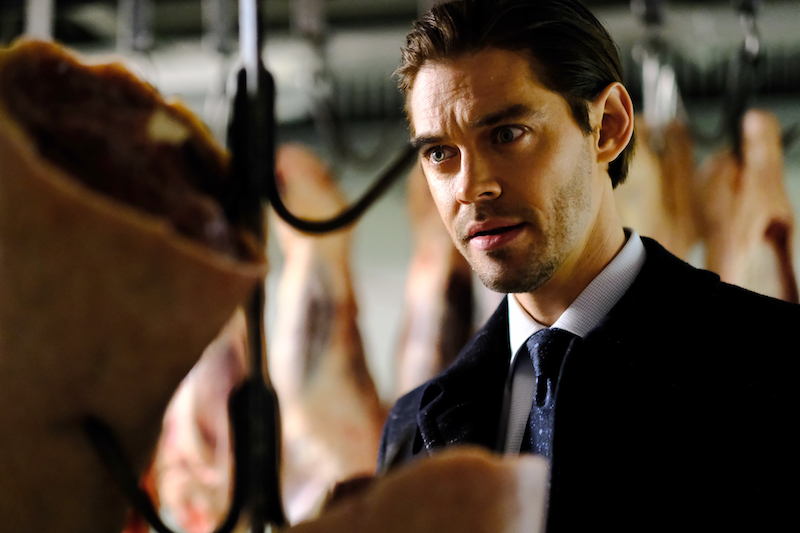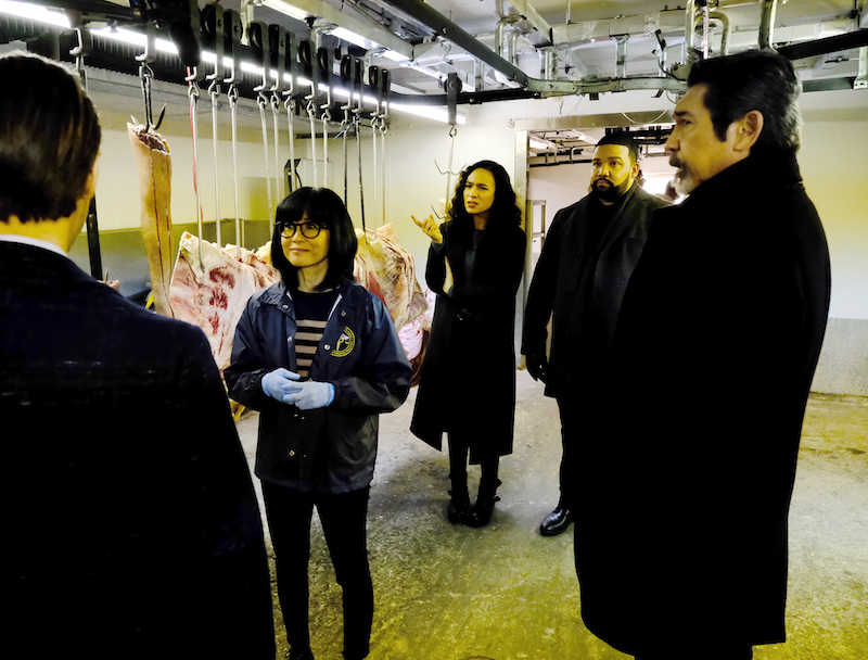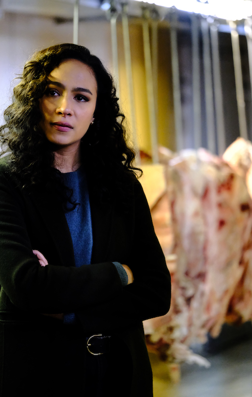 Malcolm is greeted by an excited Edrisa and teased by JT and Dani as he walks into the crime scene — a giant meat freezer. The body? Dismembered and hung on the hooks like a slab of steak — no head in sight.