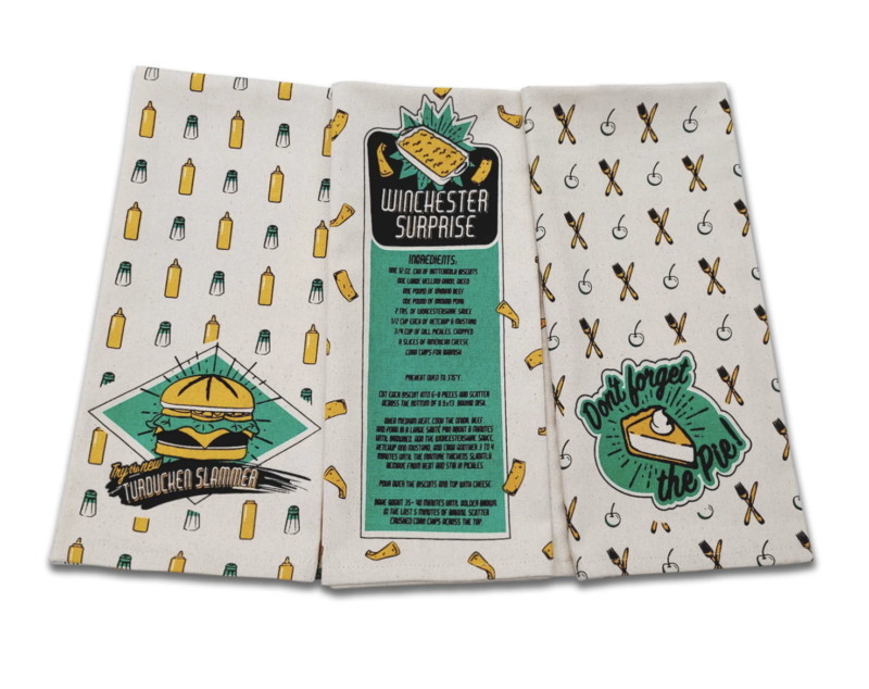 Additionally, Abel’s collection boasts a set of three tea towels — all themed around some of the most unforgettable foods from Supernatural. This set includes a towel depicting the Turducken Slammer, one with a recipe for Winchester Surprise, and lastly, a towel sporting one of Dean’s infamous quotes, “Don’t forget the pie.”