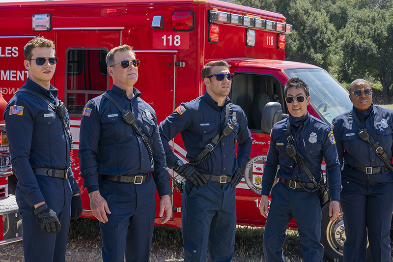 In the new photos below, the 118 is enjoying the nice weather while watching the chaos unfold and saving lives. Plus, Athena and Bobby do not look happy.
