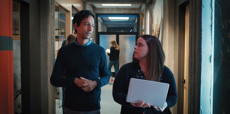 David sits with Sue in her office, showing her the poster for the new expansion as he reminds her that he has indeed always been Poppy and Ian’s boss. Poppy arrives in a panic, tells David that she changed her mind about the title, and promptly takes off with a parting line that ruins whatever elusive grasp of power David was dangling upon — “Don’t tell me what to do, you’re not the boss of me!” After storming upstairs, he has an awkward run-in with Brad and Jo, once again bringing his leadership of the company into question.