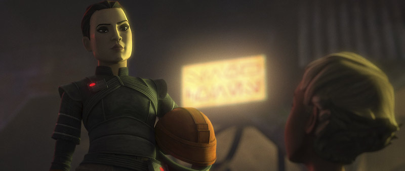 At what we assume is the equivalent of a pawn shop, Omega is looking through all the merchandise as Hunter attempts to sell the explosive for credits. The vendor says he won’t purchase the explosive because he’s running a “reputable business.” However, the vendor sees Echo disguised as a droid looking at the doll Omega found and offers 2,000 credits for him. Of course, Echo is not happy with this, but Hunter promises that once they get the credits and the supplies, Echo can escape. Reluctantly, Echo agrees to this but at an increased price. (We love a character that knows their worth.)