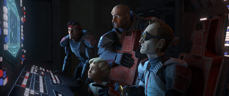 Echo and the droids complete the repairs of the ship as Hunter and Omega arrive on the speeder and Wrecker runs into the docking bay. The team boards the ship and takes off without a second thought.