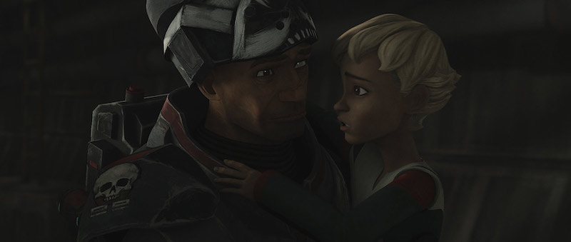 Frantically looking for Omega, Hunter comes across the discarded doll she was once holding. He picks it up and uses his enhanced tracking skills to continue to look for her. Meanwhile, Fennec and Omega are walking around when Omega admits she’s hungry. Fennec not-so-accidentally bumps into a food vendor and sneaks two pieces of fruit for her and Omega to eat. As they snack, Omega notices her blaster and asks why she has it. Fennec simply says for protection.