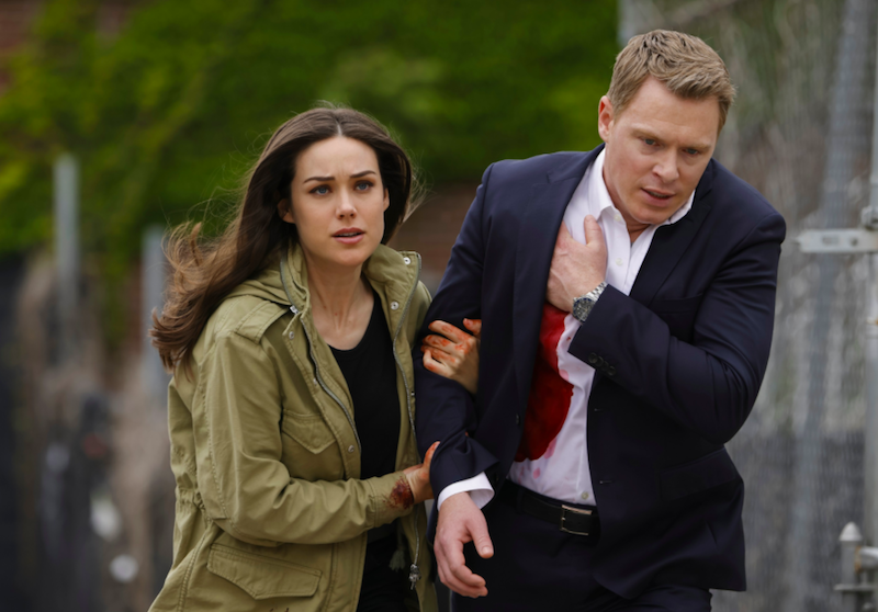 Liz and a wounded Ressler are on the run. Liz finds an abandoned restaurant and they hide in the kitchen. Liz starts tending to Ressler’s gunshot wound. Simultaneously, Vandyke and more of Neville’s men spread out to find Liz and Ressler. They find blood on the doorknob on the backdoor of the restaurant where Liz and Ressler are seeking refuge. Liz is taking care of Ressler’s wound when she hears glass breaking. She goes to investigate, but someone comes behind her and she shoots them; they struggle, and there’s one final gunshot. Ressler calls out to Keen, and she appears to say they need to keep moving.