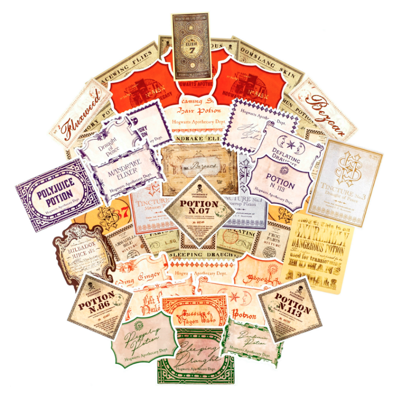These elaborate decals are Potions Labels featuring Harry Potter fans’ favorite potions, elixirs, and magical ingredients, including Polyjuice Potion, Bezoars, frog parts, Hogwarts Apothecary, Horace Slughorn’s Apothecary, and more decorative decals from the Wizarding World!