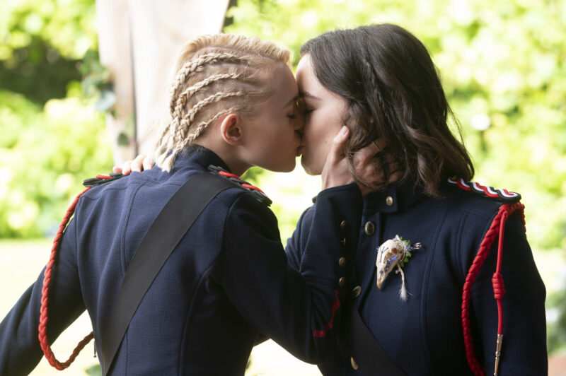 It’s at Fort Salem that Raelle meets Scylla Ramshorn, a necromancer who is more than a little interested in Raelle. Scylla’s mysterious attitude and penchant for breaking the rules enchants Raelle from the get go. For Raelle, Scylla is a rebel just like her who doesn’t blindly follow orders and the two begin a steamy romance that sees Raelle ditching training to spend more time with Scylla. The catch? Viewers know that Scylla is part of the enemy group, the Spree, who are responsible for killing hundreds of people. Raelle doesn’t know about this or the manipulative lengths Scylla goes to to keep Raelle in her grasp. But much like any romance, it’s a give and take relationship. Raelle realizes Scylla isn’t willing to open up, and begins to pull away. That’s when things change for the couple. Scylla is forced to either open up or fail her “mission” (Raelle) and so Raelle gets half-truths from Scylla that pull her in deeper.