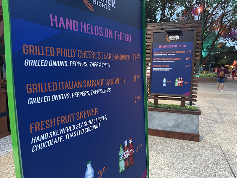 When entering the “Summer Nights” portion of Busch Gardens near Iron Gwazi, there were several booths with menus featuring the speciality foods, drinks, and even adult beverages offered during the event. There were a few booths open outside of the festival area and some scattered around the park, as well as The Giraffe Bar. Checking a few of the booths before the festival area and before enjoying their firework show, the stations were closed. However, when you walk into the field to find your seat for their nighttime firework show, they did have a small concession stand with popcorn, churros, cotton candy, and bottled beverages.