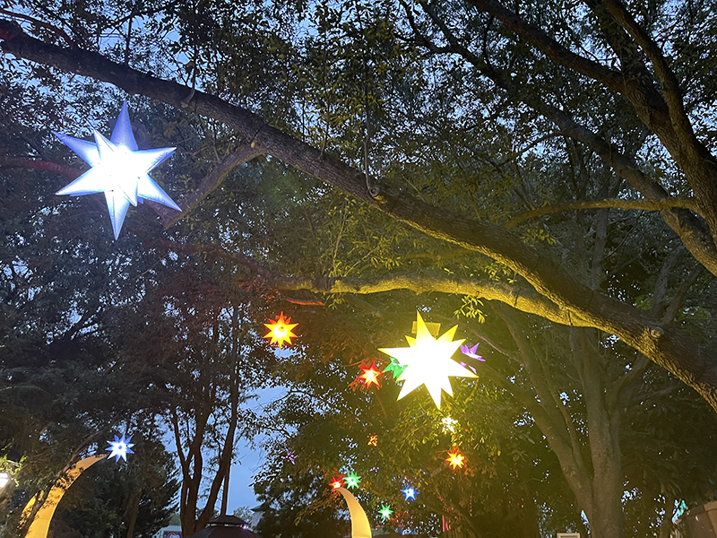While the whole park wasn’t decorated for the event with lights and signs, the festival pathway had beautiful lights and stars strung up in the trees, and they lit the way for guests to reach the field where the nighttime spectacular was held. It added life to the area, and helped guests feel that “Summer Nights” glow. Also, while exploring around the theme park, there were music booths and several colorful costumed dancers, who were inviting every one to join in on the dancing and music! The environment felt adventurous, fun, and liberating!