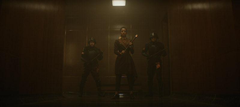 Now directly following the ending of last week’s episode, the Variant is at the TVA and gets a rude awakening when she learns that her magic is no good here. She wasn’t expecting that. However, her hand-to-hand combat is just as impressive as her magic prowess, and she takes down a small squad of four Minutemen singlehandedly. Then, Loki arrives through the time door hot on her heels. He fetches his confiscated knives from the lockers before starting his pursuit.