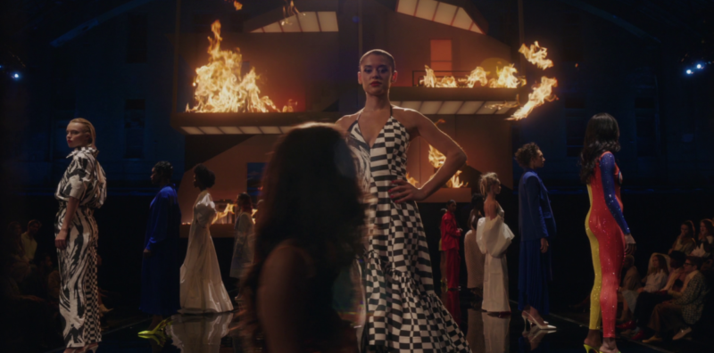 Play Zoya walking into the venue; black strands blow-dried into voluminous curls resting into a vibrant sequin-speckled orange jumpsuit reflecting the blue-ish tones surrounding her. Running straight into Monet, that’s more staged than accidentally intended, who trades phones by dropping the others back into their clutch. Luna sneaks Max off to a bathroom stall, needing to take the filthy d*** pic. The pleated curtain shatters down, revealing a three-room dollhouse with models segregated into each; Julien’s slumped on a chair in the top-right square watching the sight of red fabric disappear as each makes their way onto the runway located just below. It goes to plan. First, there’s the heartbeat flash of cameras acting as a harmonized melody to ROSALÍA’s “A Palé,” the sight of trickled water brushing the runway as the models pass. Then as the beam shines from above to announce Julien’s arrival, there’s the airdrop ding with the sender pegged as Zoya causing security guards to escort her out captured onto the laptop all the teachers are watching.