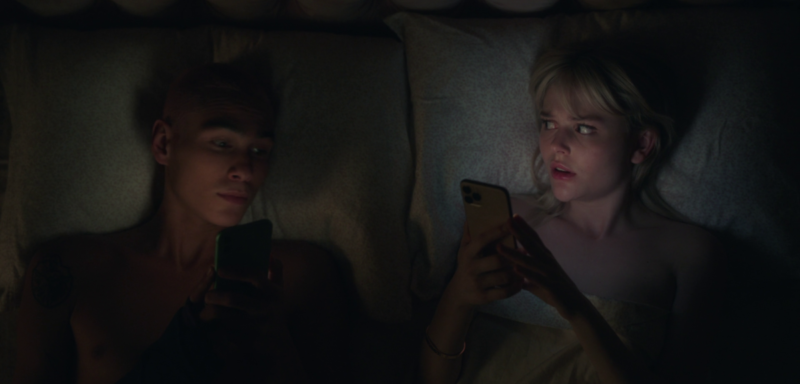 With the silence of an I love you, curling into their respective sides to turn away from each other, Aki and Audrey’s phones vibrate with the blind — not uttering a peep about either of their forbidden displays. Julien’s picked up a friend in the club’s bathroom; she looks a lot like the blonde from You, taking the form of a Gossip Girl alum, Penn Badgley Easter egg. She’s ranting about being a man’s secret. Something tossed into an underwear drawer so no suspecting possible girlfriends or wives can spot her. Walking past an appreciative glaring Max, Julien just behind her, she disappears off to a table where Davis is. There seems to be a troublesome father problem with Max’s, too, as his profile shot rests in a square mosaic with other freshly available men. The teachers are on a scout for a fall gay, a penned term for pushing Rafa under the school board’s bus. The only problem is that he’s too charming, so it opens the question of if not him, who?