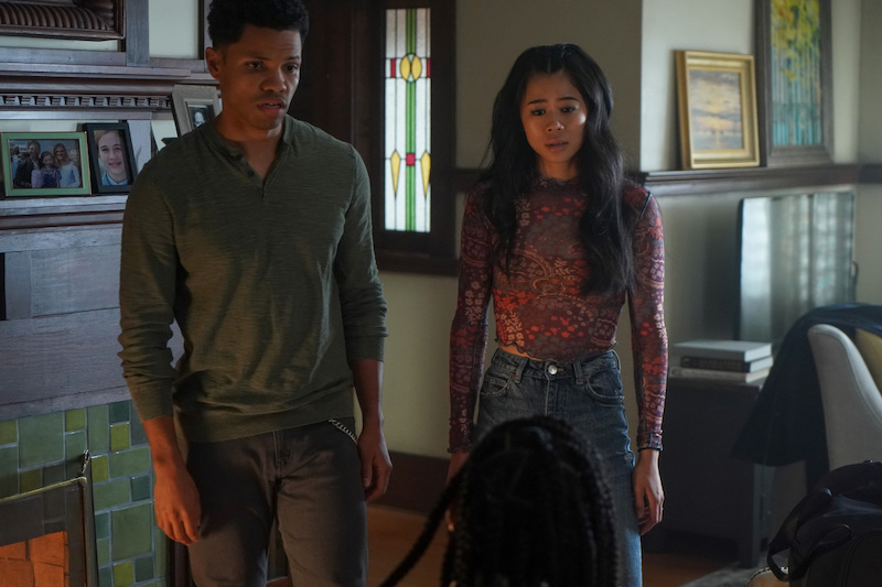 Nancy sees Ace’s text later that evening as Park heads out. She says nothing as she contemplates what to do. At the historical society, Ace puts the key back together. When he tries it in the lock without knowing what it does (a Nancy Drew move if I’ve ever seen one), the lighting suddenly changes to a muted blue. Nancy walks in, silently noting that the time is past 9 p.m. She went to the loft, and he wasn’t there as promised. It’s clear she had feelings for him too, and now he’s blown it by being late. He stammers an apology as she leaves without acknowledging him. Chasing her down, he finds himself outside the Drew residence.