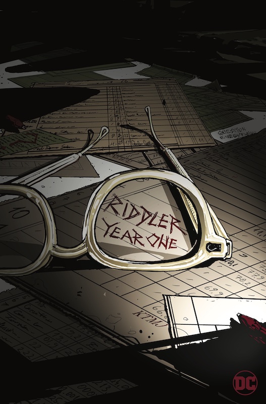 Along with the announcement for the comic came a teaser photo featuring the Riddler’s iconic glasses atop a pile of files, some scribbled with writing such as “question everything” and the title for the comic.