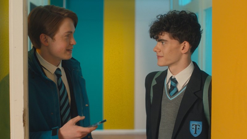 Episode 1, “Meet,” begins with Charlie walking through Truham Boys’ School to meet with his secret boyfriend Ben (Sebastian Croft), only to be blown off via text at the last moment. Charlie returns to class, dejected. The very picture of a stereotypical TV teen’s bad day, he learns that he’ll be sitting with “one of the rugby boys” for the rest of the year due to a new seating plan. Then the crowd clears, and growing sunlight shines rainbows through the window behind Nick, haloing him as he looks up at Charlie and smiles. Oseman’s distinctive leaf art flutters charmingly across the screen in pastel.