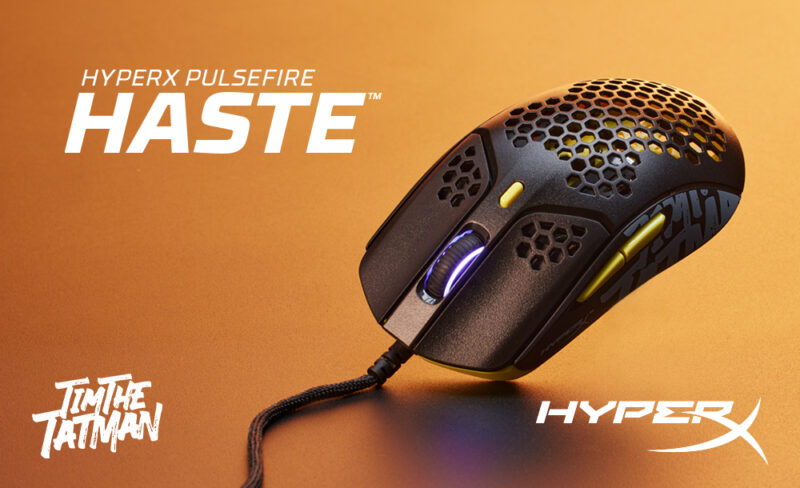 - HyperX Pulsefire Haste Gaming Mouse: The HyperX Pulsefire Haste is built for gamers looking to gain every fraction of a second advantage possible. Weighing in at 59 grams, this feature-packed, responsive honeycomb shell mouse utilizes TTC Golden micro switches to provide satisfying, reliable clicks and are rated for 60 million clicks. The flexible HyperFlex USB cable and the virgin-grade PTFE skates work together to provide a smooth, easy glide. Featuring a custom black with yellow accents design, the TimTheTatMan edition maintains everything that makes the Pulsefire Haste special.