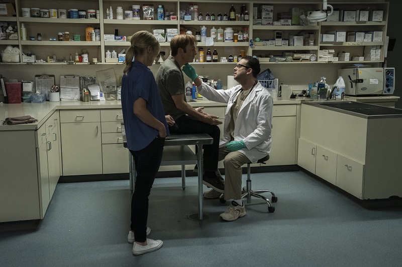 Jimmy and Kim are at Dr. Caldera’s office, the veterinarian who helps out folks needing not-so-legal medical (and other) assistance. Dr. Caldera gives them a small bottle of a drug that causes the user’s pupils to dilate significantly. The vet assures Kim and Jimmy that the drug cannot be detected on a blood screen, and the only “wild card” in this plan is the recipient’s tolerance to caffeine.